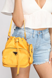 Get influenced by chic with a bucket bag that brings the style! The bag features a drawstring closure, a short shoulder handle, a large zippered compartment with an inverted triangle accent, and a side zippered compartment. Includes a detachable shoulder strap. Complete the look with a basic tee shirt and shorts for those girl-next-door vibes.