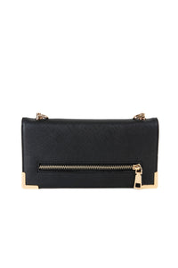 Minimal with max impact. This black crossbody wallet features a flap opening with a zipper detail, a gold metallic hardware trim, and a detachable gold chain and faux leather shoulder strap for versatile wear. Wallet is composed of a faux leather material and includes several interior compartments and card slots.
