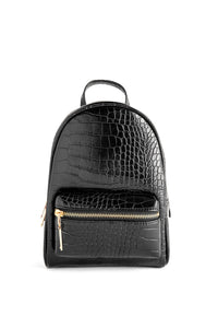 Carry all your essentials in this must have! The black mini backpack features a top zipper closure, a front zippered pocket, removable adjustable straps and a top handle. The body is composed of faux croc embossed material.Style Number/Barcode: 07203-0009