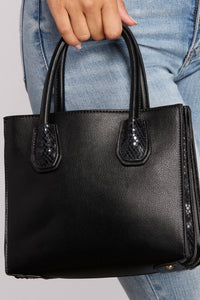 Get your hands on a cute yet simple structured purse! This baby features a square body, with U shaped handles and a detachable long strap. Purse has a snake print textured trim as well as a matching pattern print at the base of the handles, the rest of the purse simple and smooth. This satchel is composed of a faux leather material and has four studs on the bottom to for extra protection of the material.Style Number/Barcode: 07203-0054