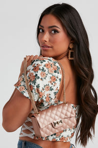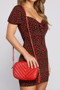 Yes babe, add a chic vibe to your look when you accessorize with this faux leather crossbody! It features a quilted chevron faux leather material with a top zipper closure, a trendy tassel detail, and a chain and faux leather shoulder strap. Pair this bag with a casual dress and chunky sneakers.