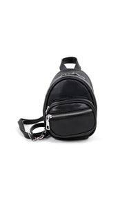 Take this cute and trendy mini crossbody backpack with you wherever you go! It features two front zippered pockets, one main zippered pocket, and an included faux leather and silver chain crossbody strap that is adjustable and detachable. The little bag is composed of a black faux leather material.