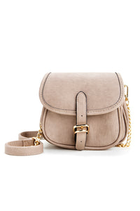 This mini saddle bag will stylishly complete your look and hold all of your essentials! It features a fold-over design with a magnetic closure and a gold buckle detail, a front pouch, and a detachable faux leather and gold chain shoulder strap. The bag is composed of a gray faux leather material.