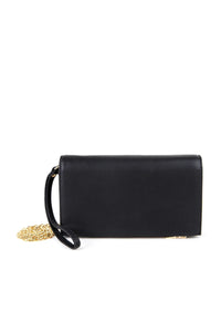 Keep this faithful companion at your side always! This black wallet features multiple card compartments, 2 zipper compartments, and an envelope design with a snap button closure. Wallet also includes a wrist strap and gold chain link shoulder strap. Composed of a faux leather material.