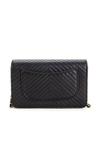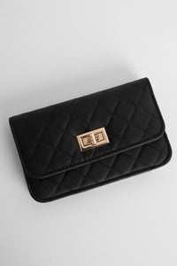 This black quilted crossbody will make your look extra chic! It features a rectangular fold-over design with a turn lock closure, multiple compartments in the interior, an exterior pocket, and an included detachable braided gold chain shoulder strap. Bag is composed of a quilted faux leather material.
