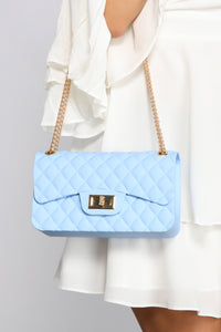Live it up in luxe with a purse that elevates your outfit. The bag features a quilted matte jelly body, a small rectangular body, a fold-over closure with turn-lock fasten, and a dainty chain-link shoulder strap. Complete the look with a floral blouse and skinny jeans.