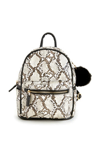 Slay your look with trendsetting snake! Keep your essentials close to you with this mini backpack that features a top zipper closure with a large removable black pom pom accent, two side pockets, a front zippered pocket, a faux leather black hued trim, a top handle strap and adjustable faux leather shoulder straps. The all over snake print features taupe and gray hues for that minimal vibe!