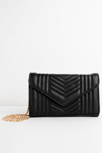 Bring a little edge into your life with this vertical quilt stitched purse. Featuring an envelope style flap with a snap button closure and a faux leather inner lining. The Inside is fully equipped with two compartments and lots of slots for cards. The clutch also doubles as cross body purse with a gold chain strap.Style Number/Barcode: 07201-0336