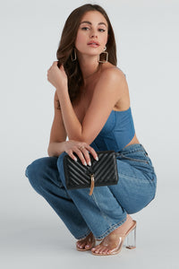 Keep your everyday look sleek and chic with this on-trend crossbody purse! It features a rectangular shape with a fold-over design with a magnetic closure, a front V-shaped quilted design, a metal tassel accent, and a chain-link shoulder strap. Complete your outfit with oversized sunglasses.
