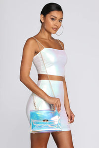Bring some magic to your look with this mesmerizing purse! The hand bag features an all over holographic body, a top handle, a fold over closure with turn-lock fasten and a detachable chain shoulder strap. Purse is composed of a clear vinyl material.Style Number/Barcode: 07203-0101