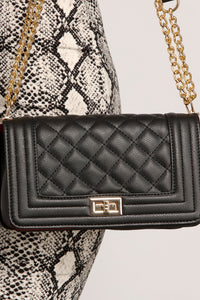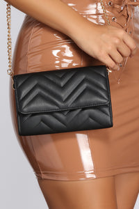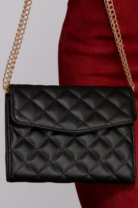 This quilted clutch is stylish and practical! Its sleek black vibe makes it easy to pair with any outfit. Hold it as a clutch or use long gold chain straps! This clutch folds shut with a snap button closure, and the best part is it's inner lining has compartments as well as slots to put your cards!Style Number/Barcode: 07203-1899