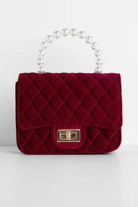 Oh yes you fancy! This mini handbag is designed with a pearl handle, a velvet quilted body, and a golden turn lock closure. Mini purse includes a detachable chain link cross-body strap and an inner zipper pocket.Style Number/Barcode: 07203-0150