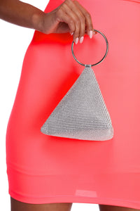 Complete your look and look so fine in rhine with this rhinestone adorned wristlet! The silver bag features a pyramid shape with a large O-ring wristlet and a side zipper closure. Bag is composed of a lined chain metal fabric embellished with mini rhinestones.Style Number/Barcode: 07204-0412