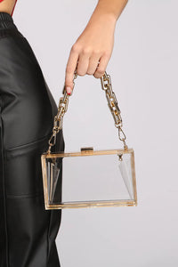 Stay on trend with a cute clear crossbody that keeps all your essentials close to you! The crossbody features a box design, a clear body, a top fasten closure, and a chain shoulder strap. Complete look with a bodysuit and joggers.