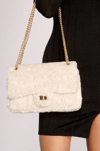 Keep it cozy and chic in a crossbody that elevates your look to the next level. The crossbody features a rectangular-shaped body, a fold-over closure with a turn-lock accent. and a chain shoulder strap. Complete look with a ribbed knit mini dress and thigh high boots.