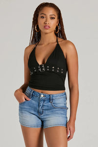 Make a statement in this halter crop top this summer! This trendy top features a flattering sleeveless halter V-neckline and spaghetti strap tie for a comfortable fit. The underbust belt buckle adds a unique touch while the fitted crop hem shows off your curves. Complete the look in high-rise jeans.