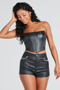 They can't get enough of you in this faux leather corset! Designed with a sleek strapless neckline, this corset features flexible boning all around for a snatched appearance and a fitted crop hem on lined faux leather fabric. Complete the look in denim jeans for a birthday dinner or date night!
