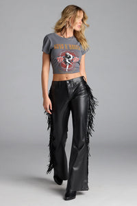 Spice things up in these sleek and trendy faux leather pants, which boast fringed side trim and a flattering flare hem—perfect for dancing at festivals or concerts!