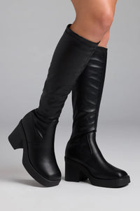 Step out in these edgy faux leather boots for day or night plans! These under-the-knee stunners are designed to be sleek and bold with a platform sole and block heel that adds trendy height to your look.