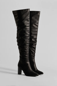 Make every strut trendy in these faux leather over-the-knee boots featured in a scrunched design with a comfortable block heel. Pair with a trench coat.
