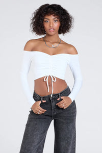 Give off a sultry flair in this off-the-shoulder top with a front tie and cropped hem that flaunts your figure!
