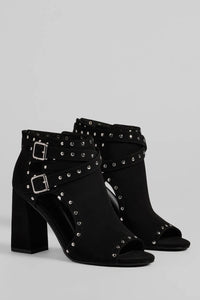 Make a bold statement with the daring details studded ankle booties. Featuring a block heel, peep toe, and criss-cross straps with metal buckles, these booties are your new go-to for standout style.