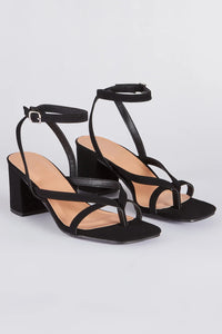 Step out with a look you'll love with these nubuck block heels to take you from a daytime outing to date night! They feature a sleek square toe, strappy thong-style toe, a faux leather footbed, a short block heel, and an adjustable ankle wrap strap with buckle closure. Complete the look with a chic handbag.