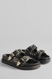 Create on-trend looks all season in these faux leather slide sandals that have a cute Western flair! They feature a curved square toe, dual faux leather straps with grommets and buckle accents with etched designs, and a comfortable footbed and rigid sole. Complete the look in a cute denim romper for a backyard BBQ party!