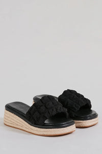 From beach vacations to sunset cocktails, these wedge sandals are perfect for summer fun! Featuring a square toe and a unique woven puff strap, you'll stand out in style. The espadrille platform wedge sole and padded faux leather footbed add comfort and elevated trendiness. Complete the look with a chic purse.