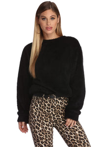 You'll know what the buzz is all about! This trendy black teddy sweater has a high round neckline, long sleeves, a relaxed fit throughout, and is composed of a cozy teddy fabric with minimal stretch.
