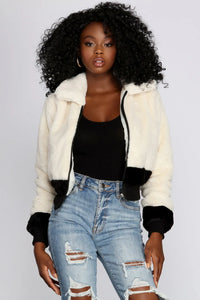 Color block it up in this trendy chic faux fur jacket! It features a collar, a zip front, long sleeves with ribbed cuffs, front pockets, a cropped ribbed cuffed hem, and a stylish color block pattern with a contrasting hue on the bottom. Jacket is composed of an ultra soft faux fur fabric with a smooth woven lining.