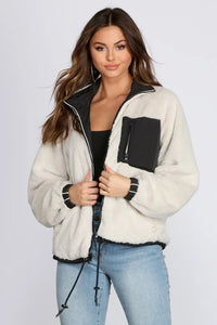 Who says you have to stick to one mood all the time? This jacket allows you to switch it up if you like! Designed to be reversible, this jacket features a mock neckline, traditional pockets at the sides- both inside and out, a zipper breast pocket, also on both sides, a zipper closure down the center, and a mid waist hem with an adjustable drawstring. One side is composed of a nylon material, and one side is composed of a sherpa offering a relaxed fit and no stretch.