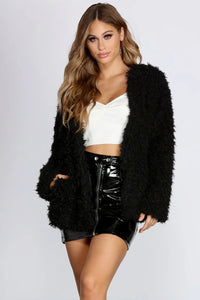 Too cozy and cute in this adorable shaggy cardi! This ultra-soft cardigan features an open front with a single hook closure, a relaxed fit, and is composed of a knit fabric with shaggy accents. Offers moderate stretch.
