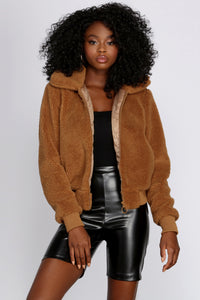 Hey babe! Zip up in this must-have to beat those cold weather blues! The bomber features a collar, a zippered front, long sleeves and side pockets. Jacket is composed of a faux fur fabric and fully lined.