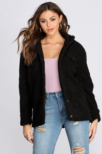 Amp up your casual look with a cute teddy jacket! Designed with a collared neckline, long sleeves, and functioning sleek metal buttons down the center. Jacket features traditional breast pockets that have functioning buttons as well. Trucker jacket is composed of faux fur, and fully lined on the inside!