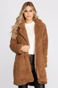 Stun in a faux fur jacket to layer with all your chic style staples. The jacket features a collared neckline, long sleeves, a single button-down front, lined side pockets, and a long line length. The jacket is composed of a lined faux fur fabric that offers a relaxed fit with minimal stretch. Complete look with a trendy plaid mini dress and ankle booties.