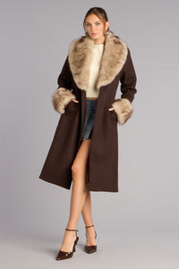 This coat doesn’t just enter the room—it owns it. With plush removable faux fur and a sleek faux wool finish, it’s your go-to for cold-weather glam. Perfect for dressing up denim or layering over night-out looks.