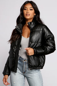 Add a chic flair to your winter look with this edgy faux leather puffer jacket! It features a complete zip and snap button-down front, a mid-length elastic banded hem, and a PU fabric with a polyester lining to keep the jacket puffed and insulated. Layer this jacket over a basic bodysuit and pair it with high rise mom jeans for a casual day with the squad.