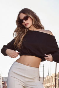 Level up your cozy game with the cutie alert long sleeve fleece crop sweatshirt. Featuring a chic asymmetrical neckline and ribbed cuffs, it's your go-to for effortless style.
