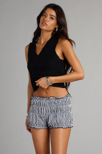 The perfect sweater vest for a preppy babe vibe! It features a sleek V-neckline and a modern cropped hem perfect for pairing with high-waisted bottoms.