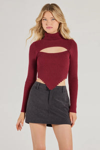 Keep it chic with this ribbed knit cutout crop top. Featuring a turtleneck, bust cutout, and v-shaped hem, this top is your go-to for standout style.