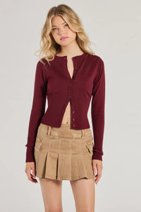 Bring your look together with a cropped knit cardigan that features a crew neckline, a button-down front, and fitted long sleeves. Pair with a pleated skirt and sneakers for a casual vibe!