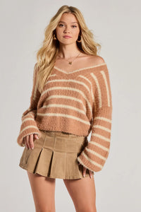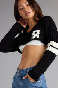 Serving varsity energy with a side of cozy-cutie. This sweater knit topper will keep your outfit looking trendy with your favorite bralette and denim jeans.