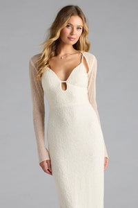 This airy mesh bolero is the perf luxe layer for your formal 'fits featuring all-over beaded embroidery. The long fitted sleeves are designed with flared hems and slit accents.