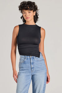 Stylish Basic Sleeveless Mock Neck Crop Top Stylish Basic Sleeveless Mock Neck Crop TopA sleeveless crop top features a sleek mock neckline, a side ruched seam to accentuate your curves, and an asymmetrical-cut hem. Style with high-rise jeans or a skirt for any occasion. Fit & Features - Knit fabric, moderate stretch
