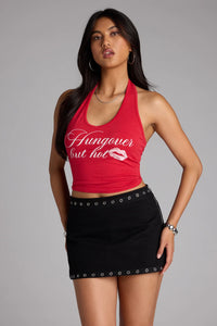Hungover But Hot Graphic Halter Top Hungover But Hot Graphic Halter TopPartied last night, serve today. This halter crop top gets you compliments even when you’re running on iced coffee and chaos. Fit & Features - Cotton-blend knit, stretchy fabric