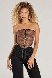 Smooth And Edgy Lace-Up Faux Suede Corset Top Smooth And Edgy Lace-Up Faux Suede Corset TopA strapless corset top boasts a front lace-up design and a fitted crop hem on smooth faux suede fabric. Perfect for styling with high-rise bottoms for going out. Fit & Features - Smooth faux suede fabric, sewn-in knit lining, minimal stretch