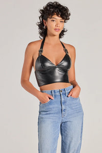 Bold Buckle Halter Strap Faux Leather Crop Top Bold Buckle Halter Strap Faux Leather Crop TopThis western-chic top features a V-neckline, a halter strap with engraved buckle accents, and a fitted cropped hem for a snatched look. The smooth faux leather fabric adds some edge to the trendy style. Fit & Features - Faux leather fabric with moderate stretch
