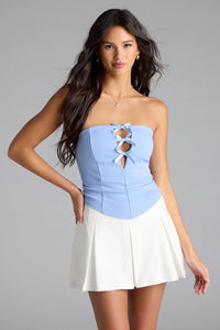 Love For Bows Strapless Ponte Crop Top Love For Bows Strapless Ponte Crop TopWhat's not to love about this adorable bow crop top? It boasts a sleek strapless neckline with front bows and a flirty cutout. Fit & Features - Ponte knit fabric, moderate stretch