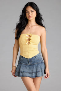 Smooth And Edgy Lace-Up Faux Suede Corset Top Smooth And Edgy Lace-Up Faux Suede Corset TopA strapless corset top boasts a front lace-up design and a fitted crop hem on smooth faux suede fabric. Perfect for styling with high-rise bottoms for going out. Fit & Features - Smooth faux suede fabric, sewn-in knit lining, minimal stretch
